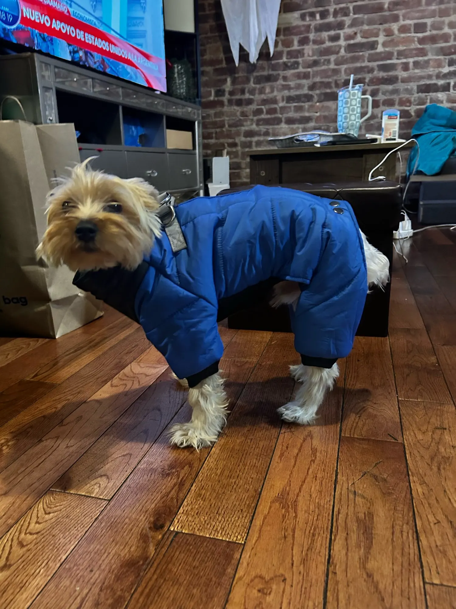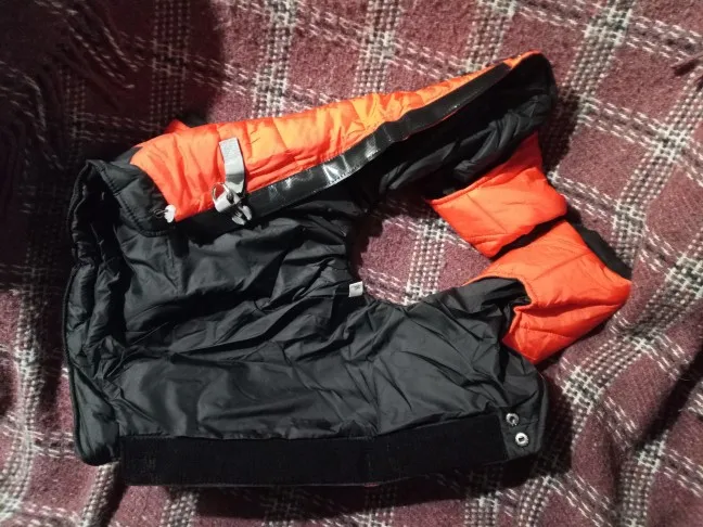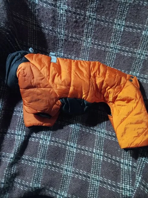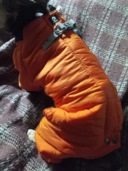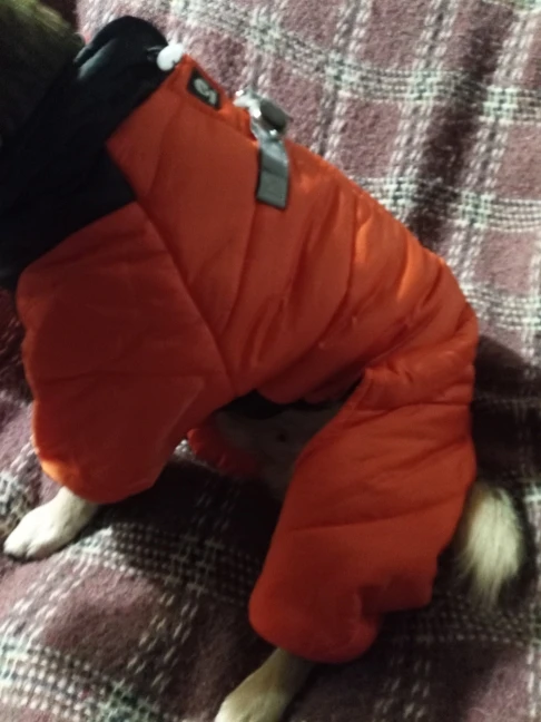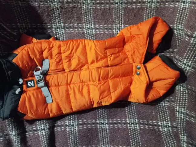 A warm winter jumpsuit. Fits a dog weighing about 10 kg. The cuffs have Velcro on the back instead of a zipper. Seems comfortable. Very fast shipping and delivery.