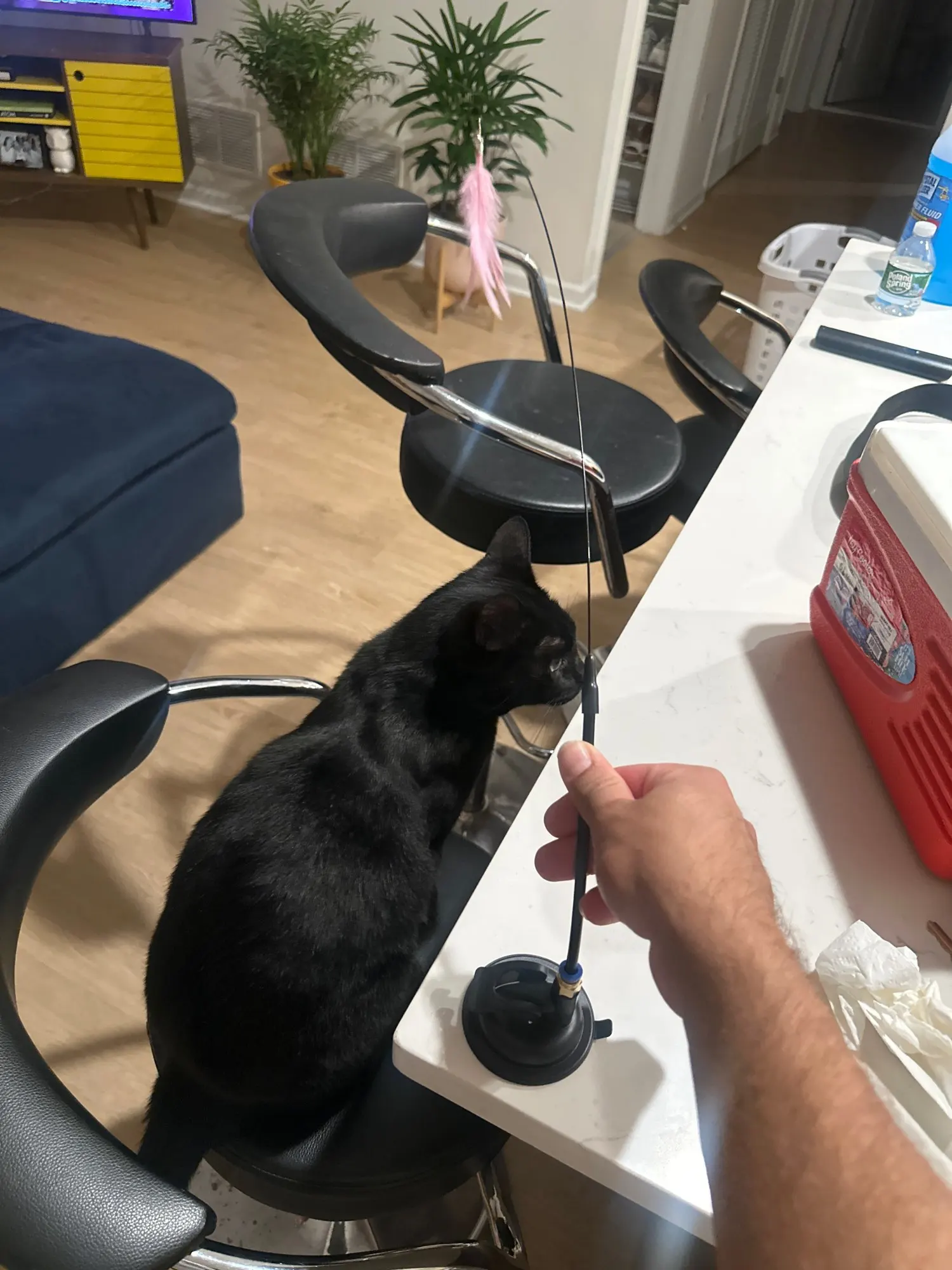 Move the feather or laser unpredictably to trigger hunting instincts. Play for 10–15 minutes daily for best results.